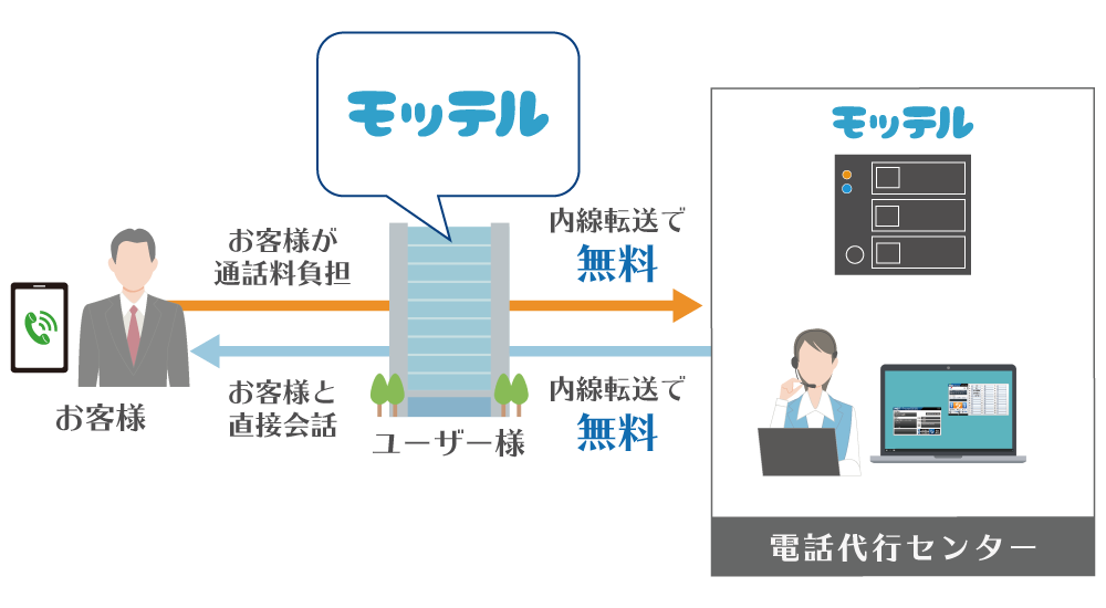 MOTと連携した電話代行サービス。電話代行への転送料無料でコストを抑えつつ、電話のストレスを軽減します。